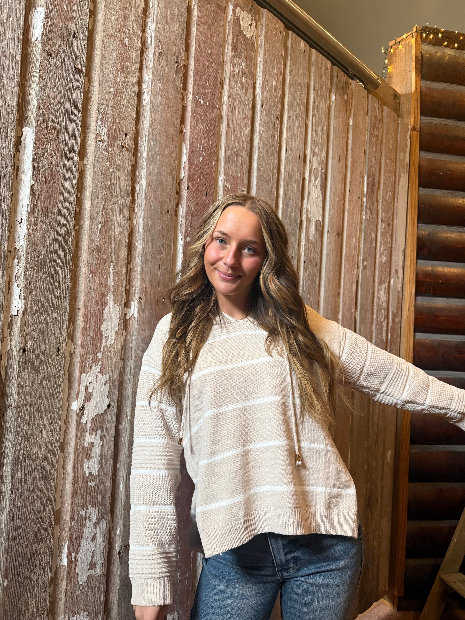 Wrap yourself in cozy clouds with the Maddie Striped Hoodie in Natural. Crafted from soft chenille-like fabric, this hoodie feels like a gentle spring breeze on a fresh morning. Its playful stripes add a touch of fun while keeping you snug and comfy all day long. Perfect for relaxed weekends or lively adventures, it’s your new favorite go-to for comfort and charm.