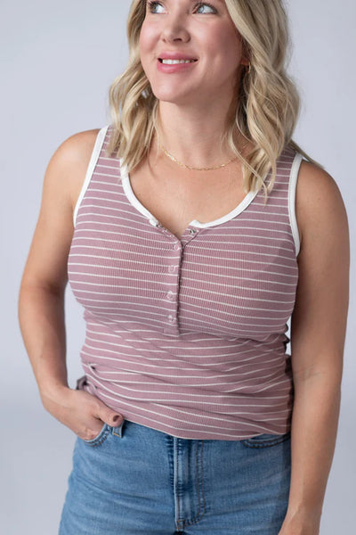 ntroducing the Shiloh Button Snap Tank - your new summer essential. With its lightweight design and button snap closure, this tank offers effortless style and comfort. The micro stripes add a touch of detail, making it perfect for any occasion. Stay cool and chic all season long.