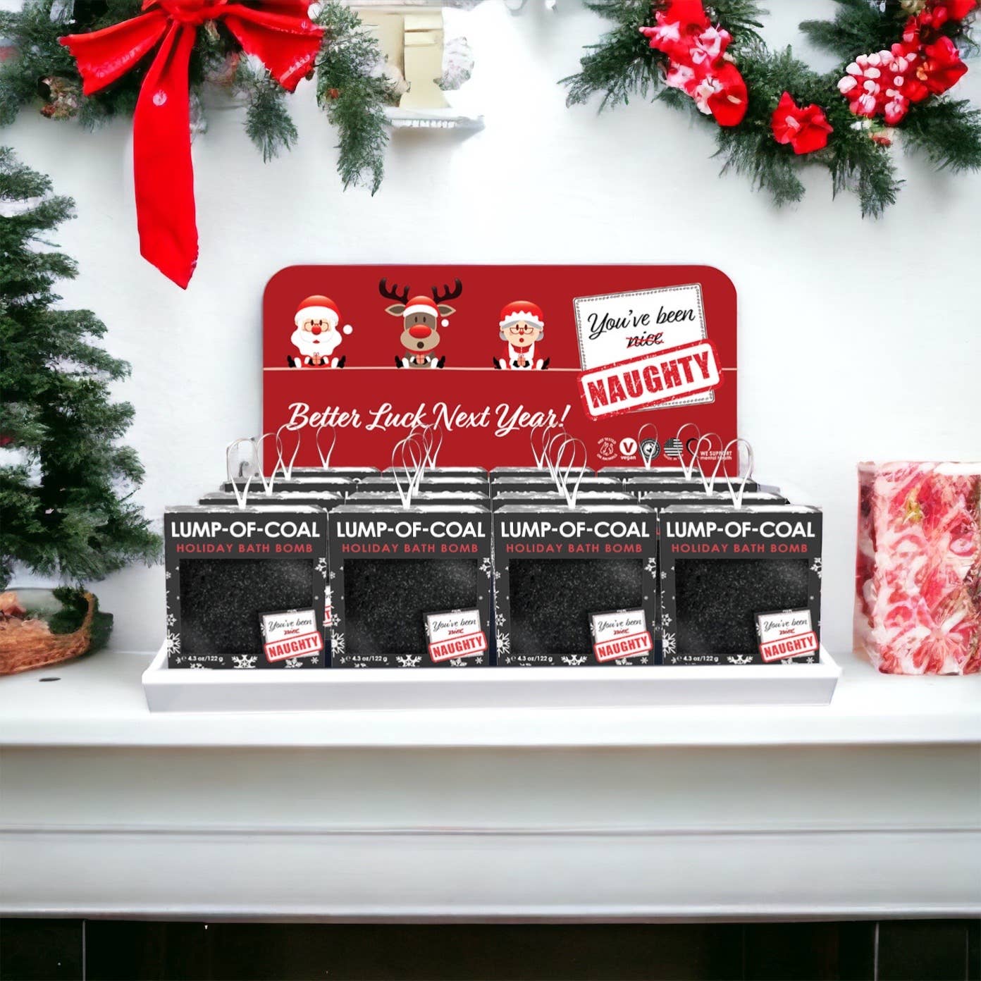 Our Lump-of-Coal bath bomb fizzes + explodes with skin softening ingredients + the holiday aroma of embers. Handmade in USA, makes a great stocking stuffer after all, even when you have been bad you deserve to feel good.